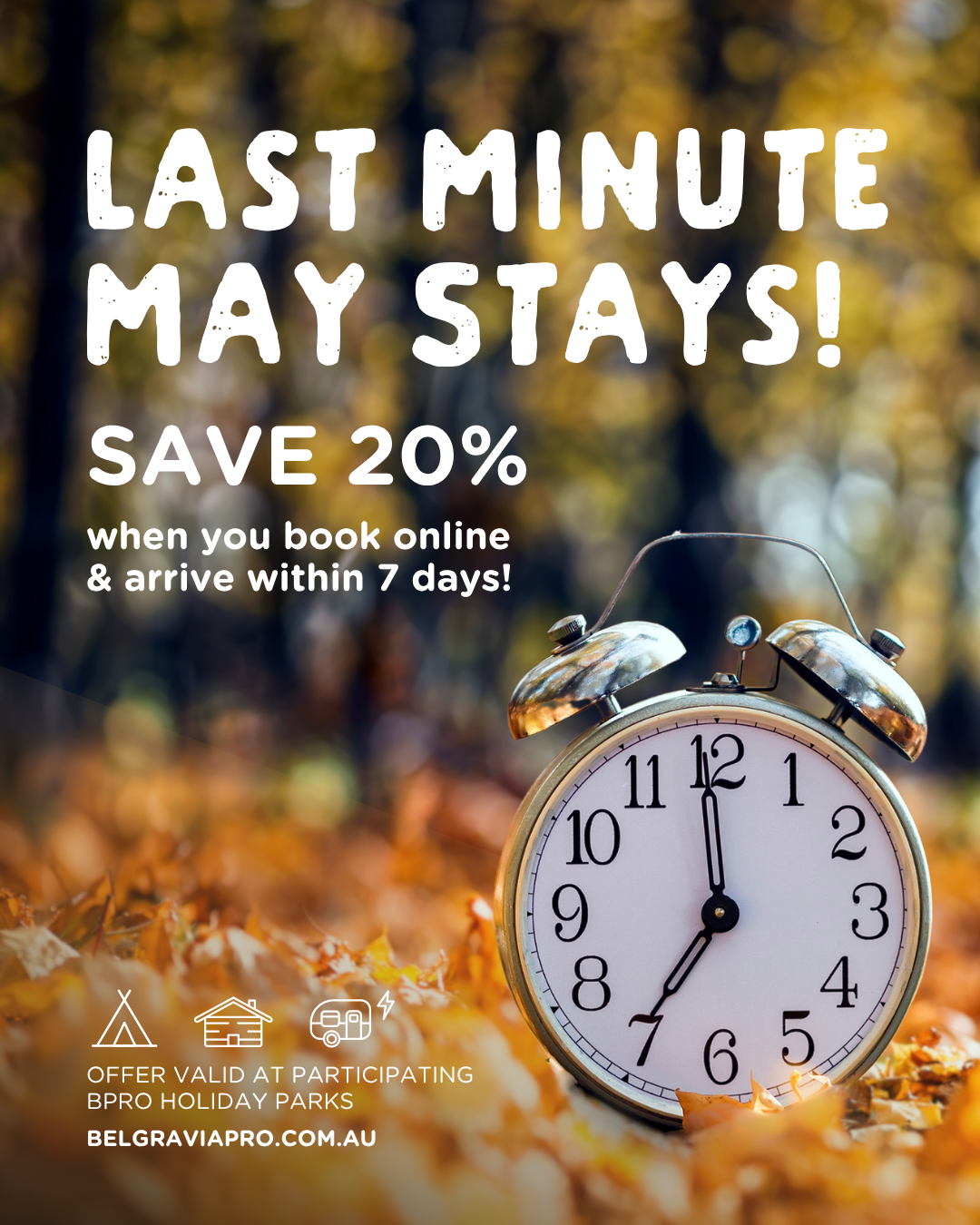 Book online and arrive within 7 days at X Tourist Park to enjoy a whopping 20% off your stay!